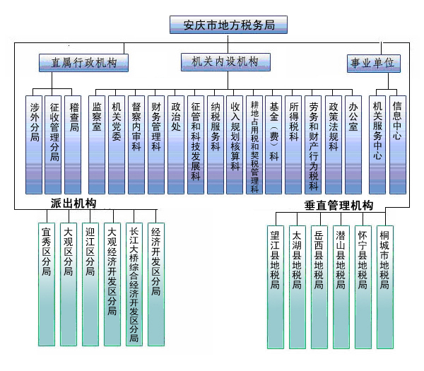 安庆市地税局基本情况 安庆市地税局辖怀宁、潜山、岳西、太湖、望江5个县局和桐城市局(宿松县局因“省管县”体制改革划归宿松县委县政府管理),下设3个直属机构和6个派出机构。市局机关内设14个科室和2个事业机构。 近年来,安庆市地税局在省局和安庆市委市政府的正确领导下,安庆地税人艰苦创业,奋力拼搏,积极进取,取得了显著的成绩。2011年,全系统共组织入库地方税费收入68.58亿元,同比增收15.7亿元,增长29.8%,为安庆市的经济发展和社会稳定作出了积极贡献。市局和所有县(市)局全部荣获安徽省第九届文明单位称号;市局被授予第三批“全国文明单位”,连续六年被市委、市政府评为争先创优目标绩效考核优秀单位,并荣获安庆市第三届文明行业称号。迎江区分局办税服务厅被评为“全国巾帼文明岗”,系统有4个单位荣获安庆市创建文明行业先进单位、有5 个单位荣获安庆市文明窗口称号。 市局机关内设机构(14个): 办公室、政策法规科、劳务和财产行为税科、所得税科、耕地占用税和契税管理科、基金(费)科、收入规划核算科、纳税服务科、征管和科技发展科、政治处、财务管理科、督察内审科、机关党委、监察室等14个。 直属行政机构(3个): 1、365娱乐网稽查局(副处级建制)。2、365娱乐网征收管理分局(副处级建制)。3、365娱乐网涉外分局。 事业单位(2个): 信息中心、机关服务中心。 派出机构(6个): 1、365娱乐网经济开发区分局(副处级建制)。2、365娱乐网长江大桥综合经济开发区分局。3、365娱乐网大观经济开发区分局。4、365娱乐网迎江区分局。5、365娱乐网大观区分局。6、365娱乐网宜秀区分局。 垂直管理机构(6个): 桐城市地税局、怀宁县地税局、潜山县地税局、岳西县地税局、太湖县地税局、望江县地税局。 |